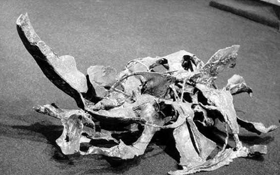 "La mort lente a tortured sculpture composed of suspended spirals -symbolizes life’s withdrawal from itself."